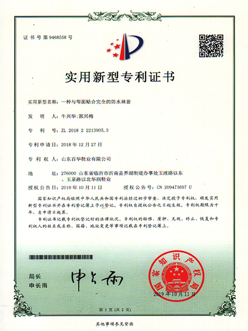 一種與幫面貼合完全的防水襪套實用新型專利證書