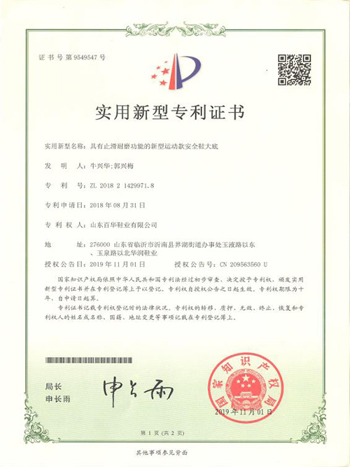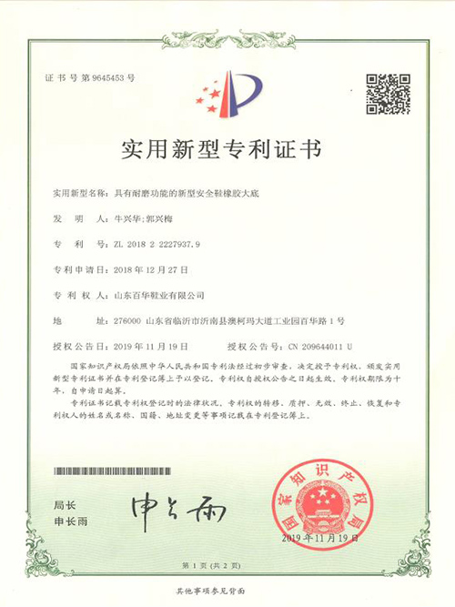 一種具有耐磨防滑功能的新型安全鞋橡膠大底實用新型專利證書
